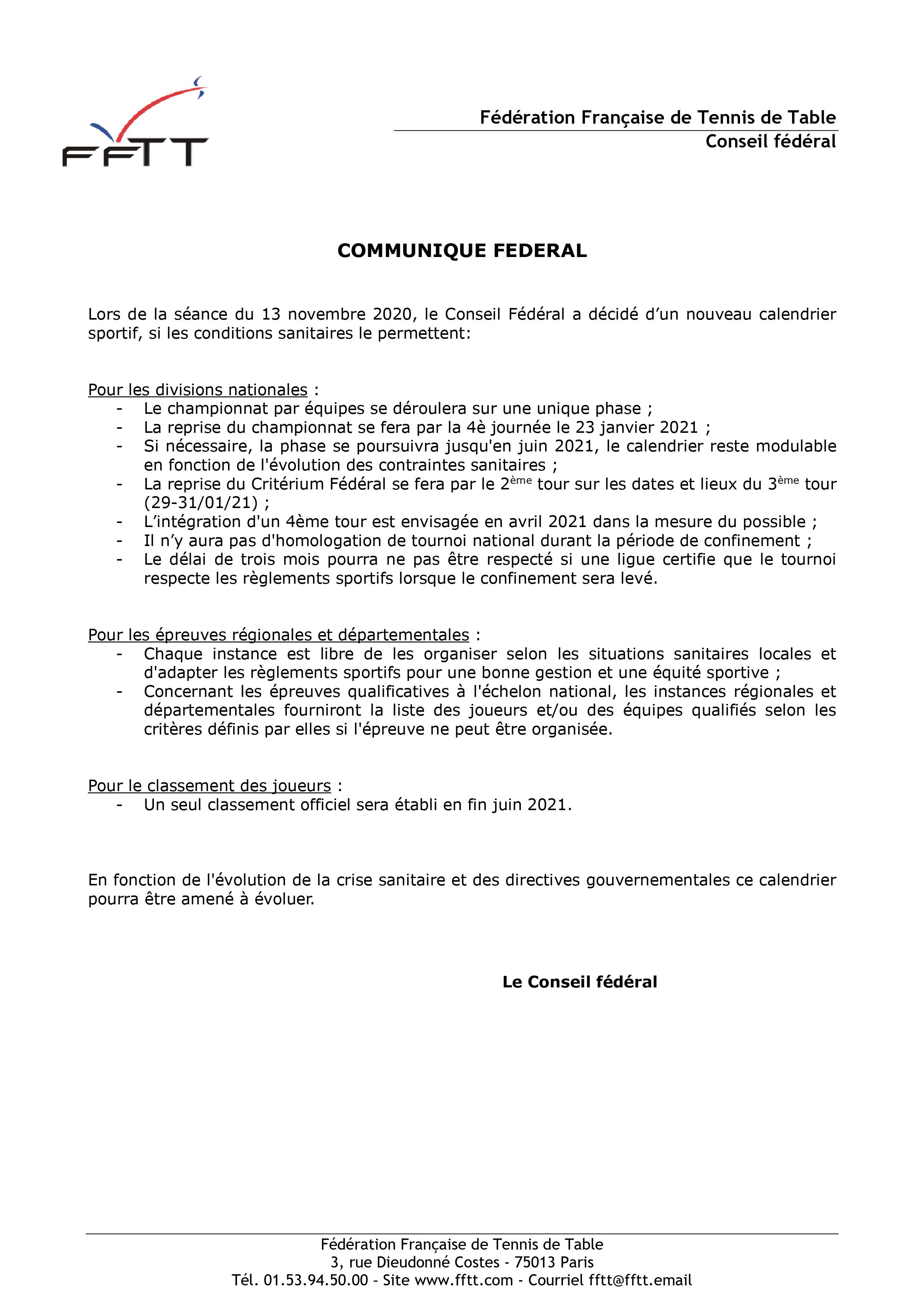 Communiqué fédéral du 16/11/2020