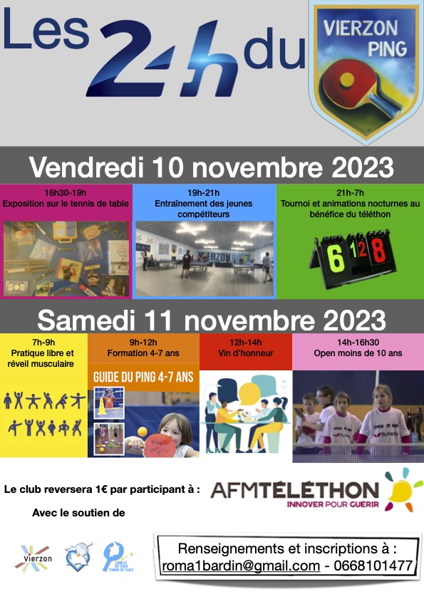 le club de Vierzon Ping vous propose de participer aux 24h du ping vendredi 10 novembre et samedi 11 novembre 2023.