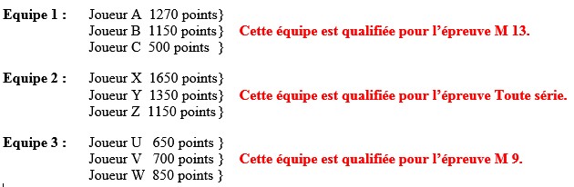 – Trois catégories : – 900 points, – 1 300 points et toutes catégories (+ 1 500 points) ;