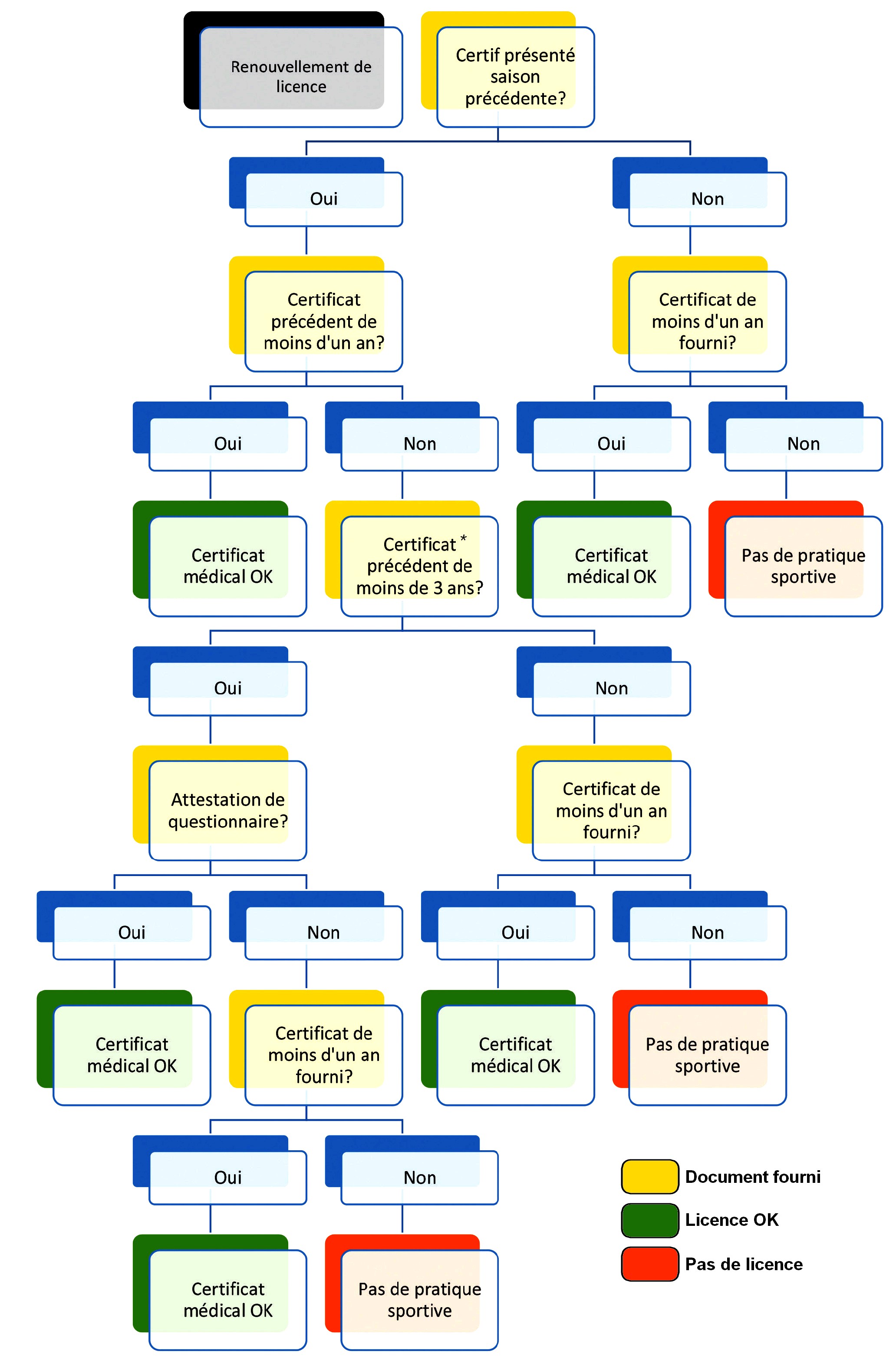 Exemple : Pour un licencié inscrit au cours de la saison 2019/2020, son certificat médical sera alors valable pour une durée de trois ans pour un renouvellement de licence sans discontinuité. Lors de la saison 2020-2021 le licencié devra remplir un auto-questionnaire, sans avoir besoin de fournir un nouveau certificat médical. Il en sera de même pour la saison 2021/2022.