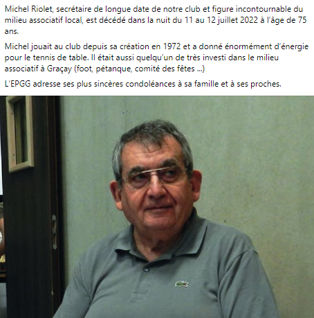 Tous les membres du comité du Cher de tennis de table, le Président Jean Paul BRUNET présentent leurs sincères condoléances à sa famille et à ses amis, nous avons tous une pensée pour Popote, pour Michel et pour Gracay.