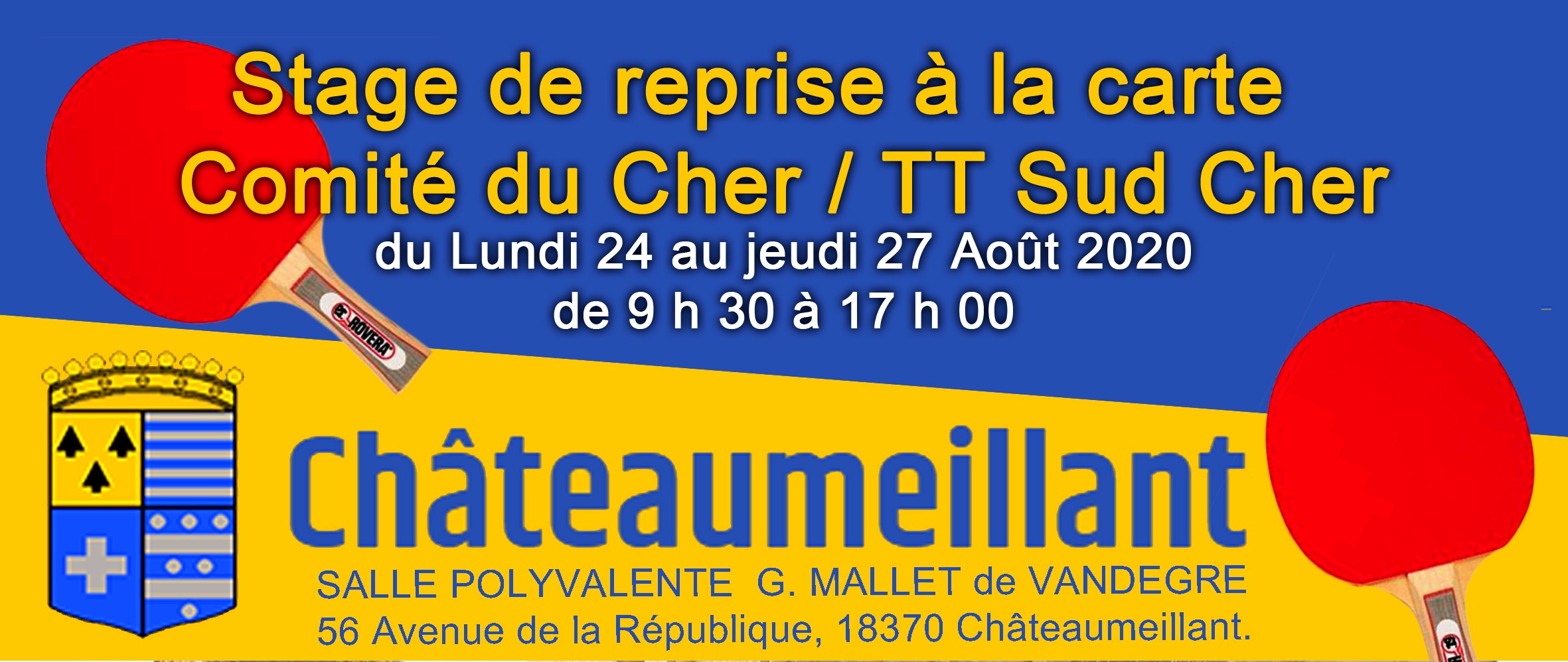 Le stage se déroule à la SALLE POLYVALENTE G. MALLET DE VANDEGRE , 56 Avenue de la République. 18370 Châteaumeillant.